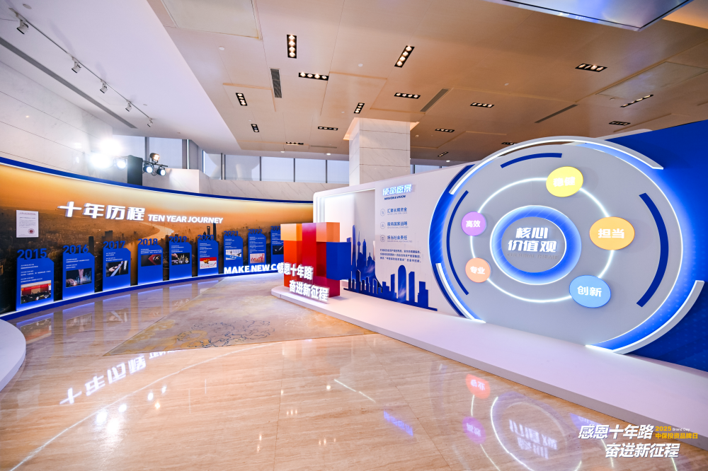 会场外设置了中保投资公司成果展。展览以“十年发展画卷”为主线,按照“十年历程—十年基石—十年责任”三大板块有序展开,设置企业文化、合作生态、发展历程与历史影像等展板,系统呈现公司使命愿景、战略路径和阶段性成果。现场通过石墨烯触控屏、地屏互动、模型沙盘及典型案例展示等形式,集中呈现保险资金服务国家战略和上海“五个中心”建设的实践成效,涵盖支持上海旧区改造、央企混改与央地合作、先进制造与高端装备、航天强国建设、绿色低碳与清洁能源投资等重点领域。展区同时展示公司社会责任实践与党建引领成果,体现“金融为民”的责任担当,并设置AR互动留念等环节,增强参观体验与传播效果。